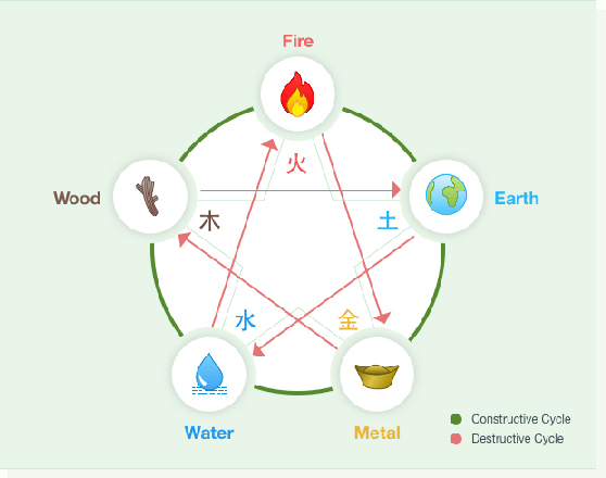 The five elements are not physical substance but influential. It describes all matters and attributes. The five elements have relative effects on each other, constructing and destroying each other in a fixed succession.