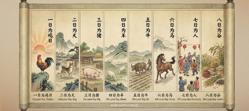 Following this belief, each animal’s day was regarded as its “birthday,” while the 7th day became known as 人日, the day humanity was formed and blessed. In respect of this cycle, the old tradition encouraged people to refrain from eating the animal linked to that day, allowing its spirit to be honored and the year’s luck to remain pure.